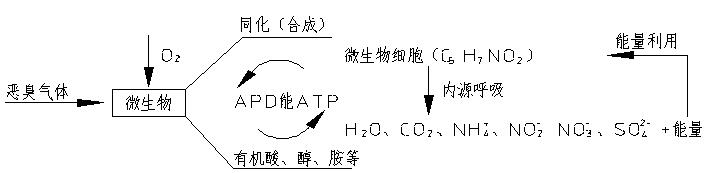 惡臭氣體成分不同,其分解產(chǎn)物不同,不同種類的微生物,分解代謝的產(chǎn)物也不一樣。對于不含氮的有機物質(zhì)如苯酚、羧酸、甲醛等,其最終產(chǎn)物為二氧化碳和水;對于硫類惡臭成分,在好氧條件下被氧化分解為硫酸根離子和硫;對于像胺類這樣的含氮惡臭物質(zhì)經(jīng)氨化作用放出NH3,NH3可被亞硝化細菌氧化為亞硝酸根離子,在進一步被硝化細菌氧化為硝酸根離子。